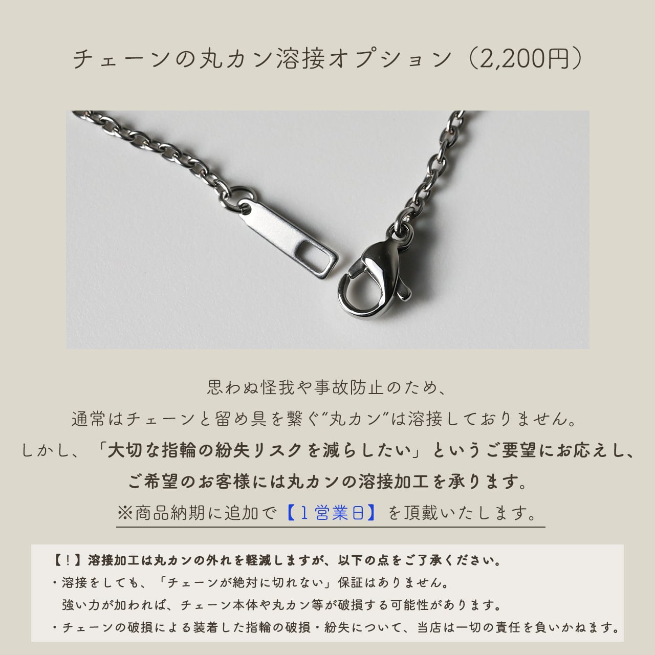 思わぬ怪我や事故防止のため、通常はチェーンと留め具を繋ぐ“丸カン”は溶接しておりませんが、 ご希望のお客様には丸カンの溶接加工を承ります。