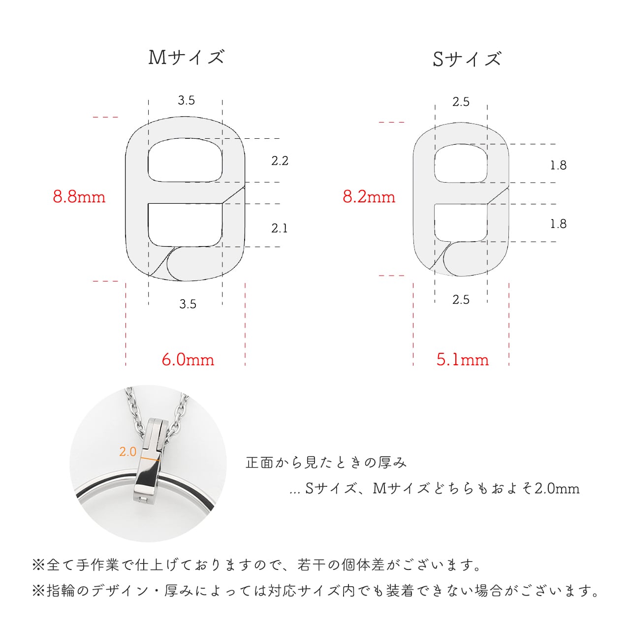 Mサイズはリング幅3.5mmまで、Sサイズは2.5mm幅まで対応。アトリエクラムのブライダルリングに最適化されたサイズ感です。