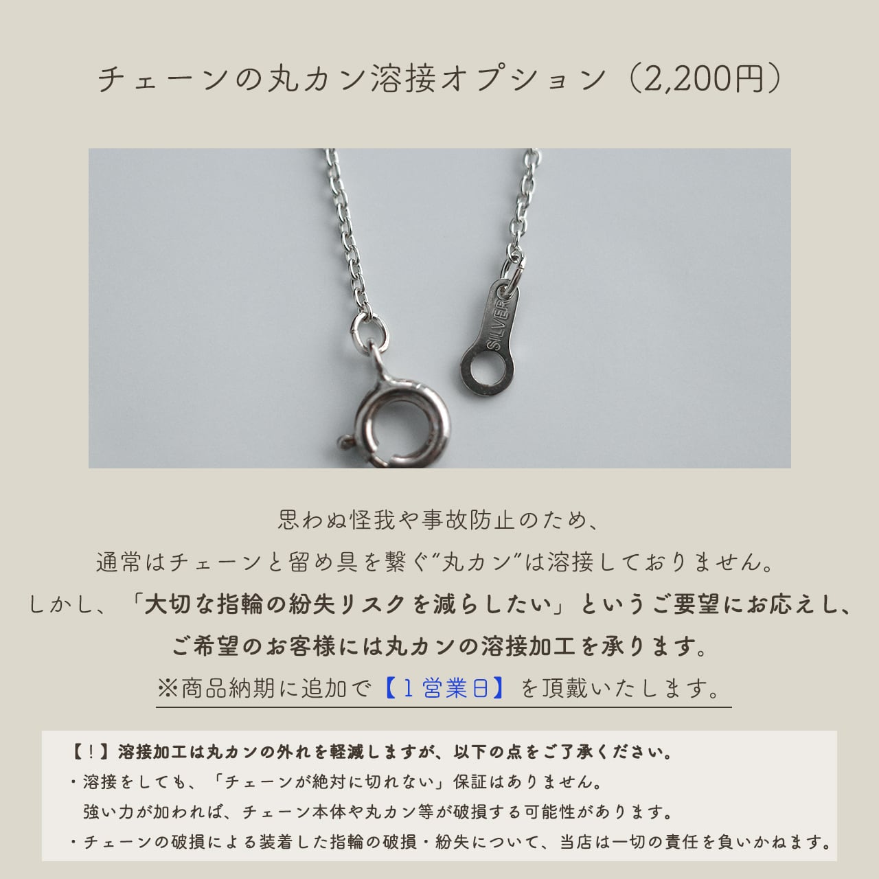 思わぬ怪我や事故防止のため、通常はチェーンと留め具を繋ぐ“丸カン”は溶接しておりませんが、 ご希望のお客様には丸カンの溶接加工を承ります。