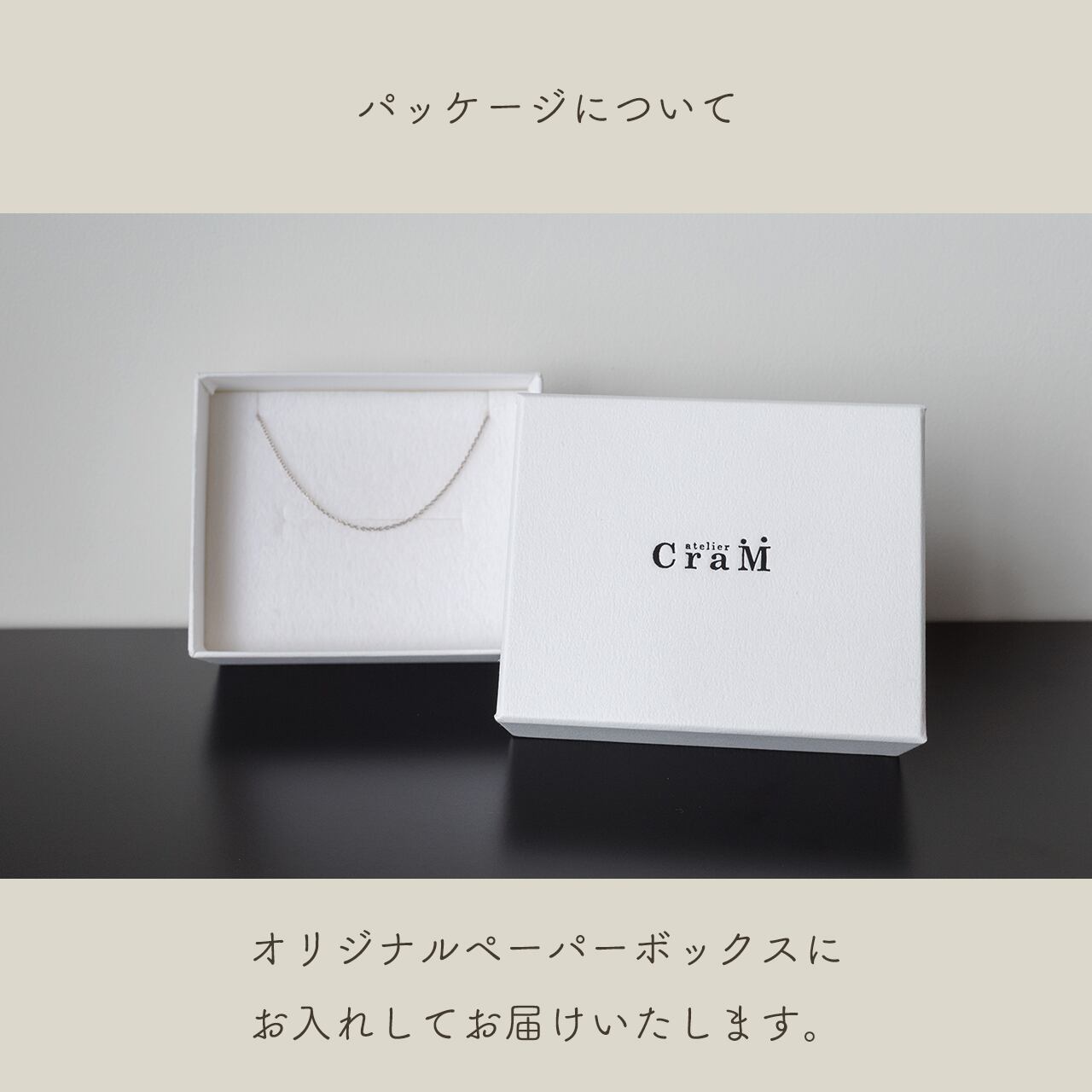 ※「K18ブラウンゴールド」は、ホワイトゴールドをベースに独自の配合で色調を調整した、アトリエクラムのオリジナル素材です。チェーン部分には地金品位として「K18WG(ホワイトゴールド)」の刻印が入りますが、本体・チェーンともに同系統のK18ブラウンゴールドの色味で統一されています。